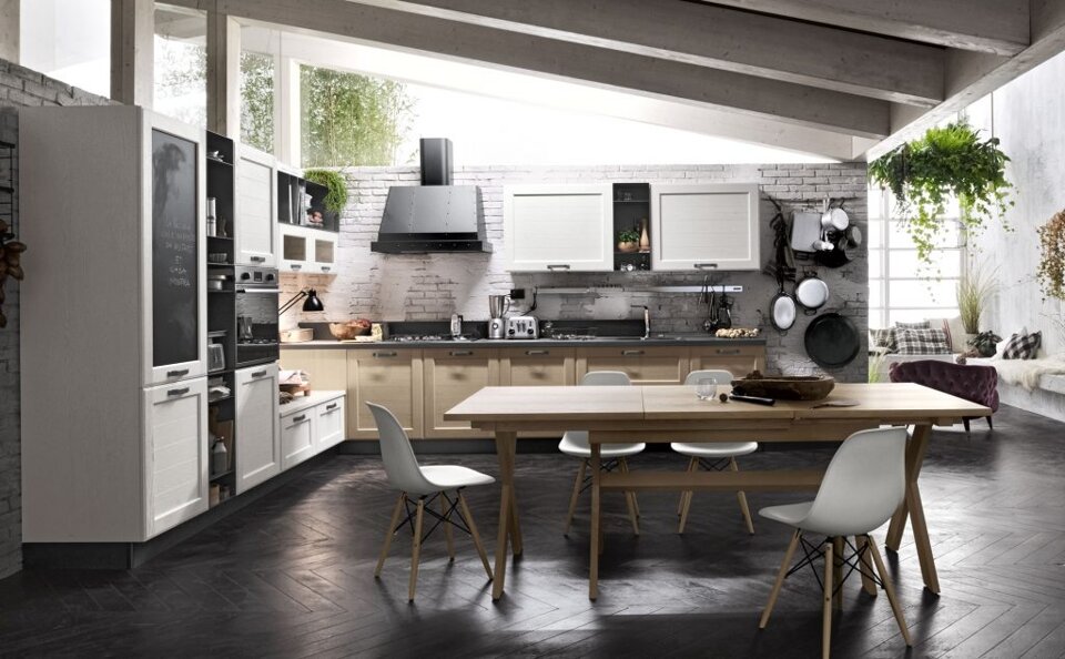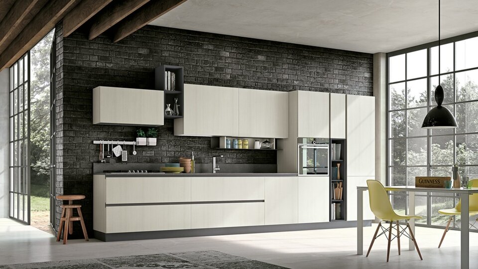 • La STRUTTURA, anche detta "fusto", delle cucine in commercio è quasi sempre in nobilitato melamminico. Come abbiamo già detto in riferimento ai piani top, i pannelli nobilitati sono costituiti da una base di agglomerato di legno rivestita da lamine ottenute mediante l'accoppiamento a caldo di fogli di cellulosa impregnati con resine a base melamminica (sintetica) termoindurenti. Le carte impregnate utilizzate per il rivestimento delle strutture sono generalmente monostrato, e offrono una buona resistenza alla macchia e al graffio.